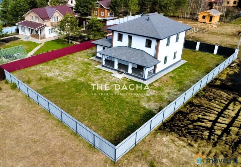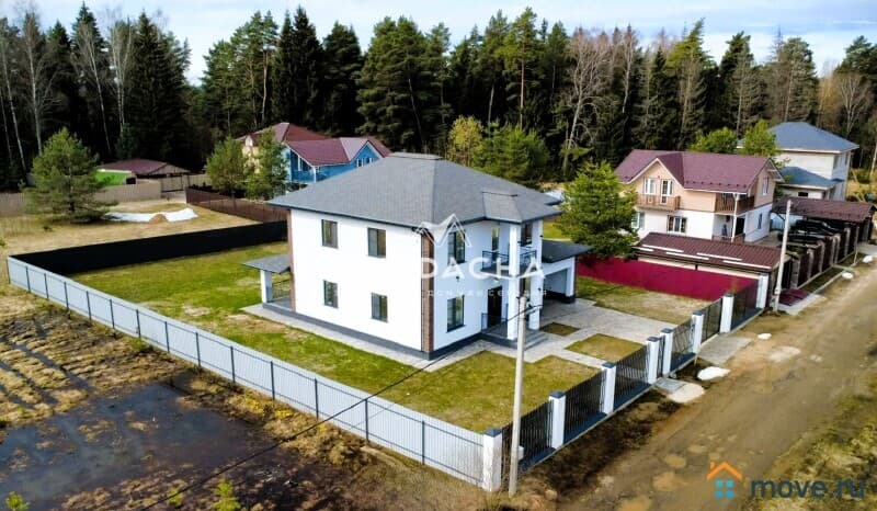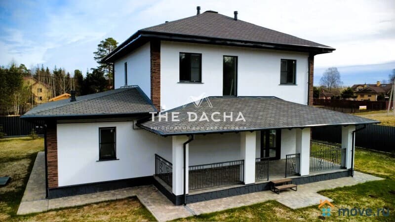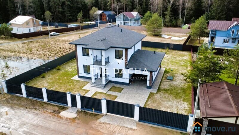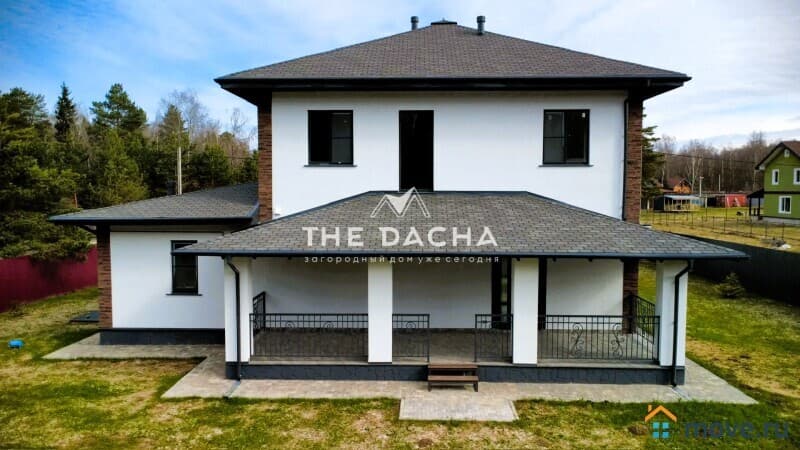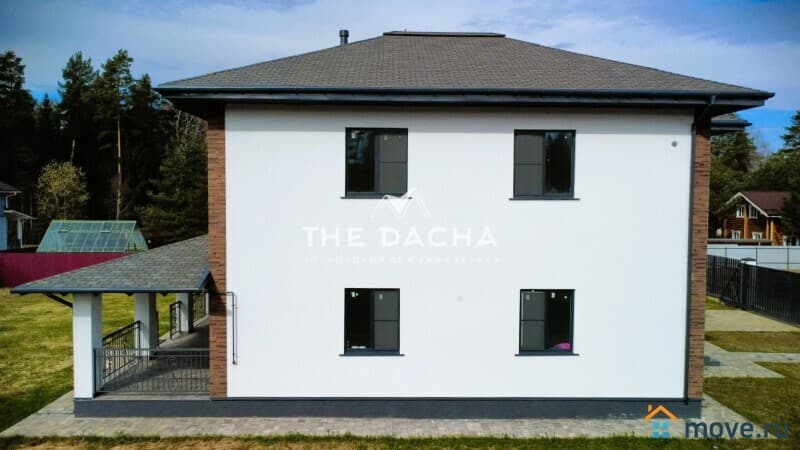 Характеристики дома: Площадь дома: 272,4 м2, фундамент: монолитная армированная плита, материал стен: газосиликатный блок + декоративная штукатурка короед, окна: качественные стеклопакеты (70 профиль, ламинированные с внешней стороны в темный цвет), перекрытия монолитные, кровля: мягкая черепица + утепление, установлена водосточная система.