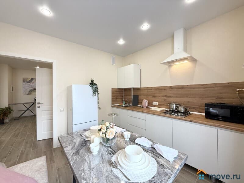 ? Кухня оснащена всеми необходимыми бытовыми приборами (холодильник, микроволновка, электрический чайник, духовка) и столовыми принадлежностями (кастрюли, сковорода, кружки, тарелки, столовые приборы).