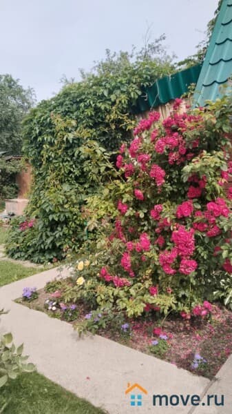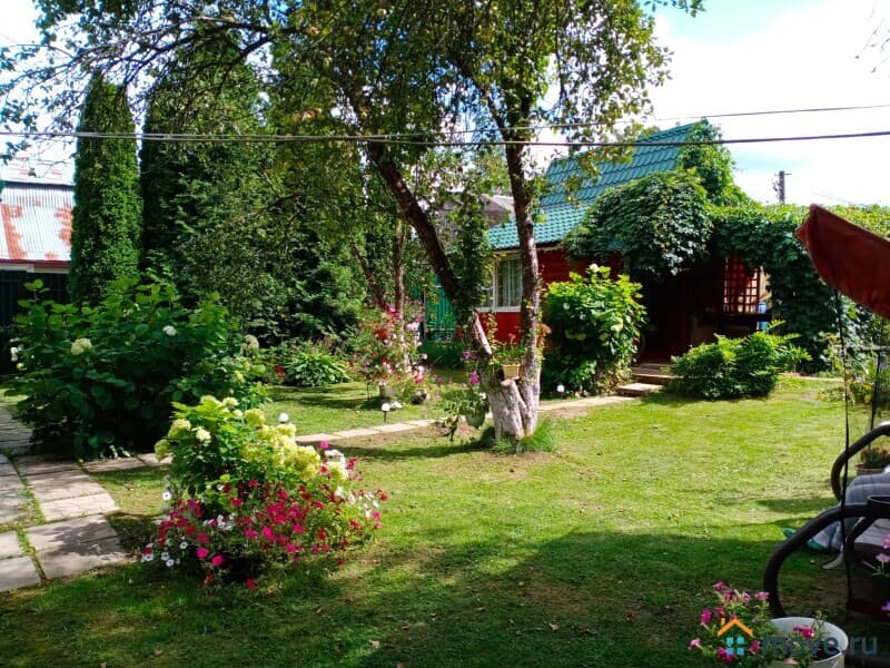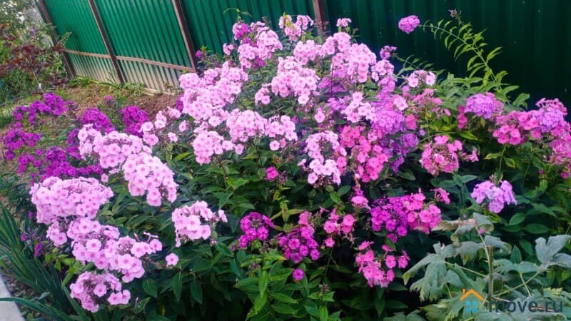 участке много кустарников и плодовых деревьев,цветы и газонная трава, многолетние туи.