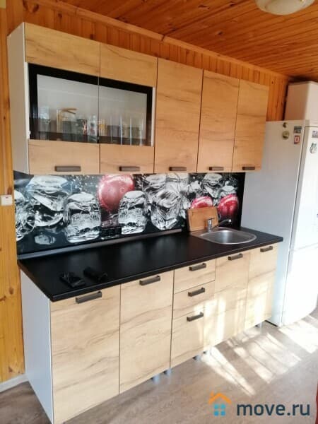 Основным стоением является кирпичный дом. Площадь 1-го этажа 50 м?, 2-й этаж мансардный 30 м кв. На первом этаже большая терраса с оборудованной кухней и лесницей на второй этаж. Одна комната и санузел с душевой кабиной. На втором этаже одна большая комната с выходом на лоджию. Внутри дом обшит вагонкой. Окна ПВХ. Свет 220 в. Снаружи дом отделан декоративными панелями.