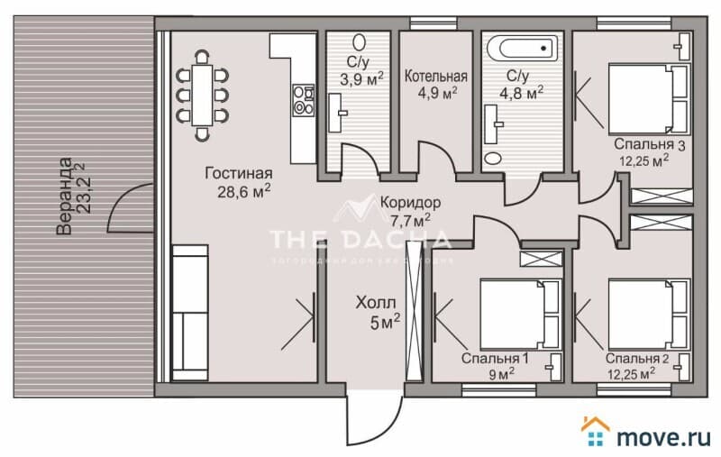 Планировка: прихожая, коридор, котельная, 3 спальных комнаты, два санузла,