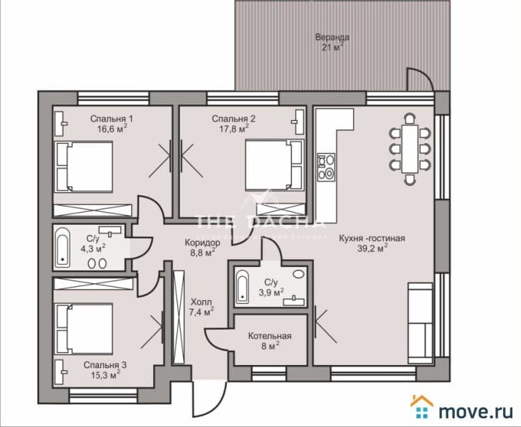 Планировка: прихожая, котельная, коридор, просторная кухня – гостиная с выходом на террасу, 3 спальных комнаты, 2 санузла, крытая терраса.