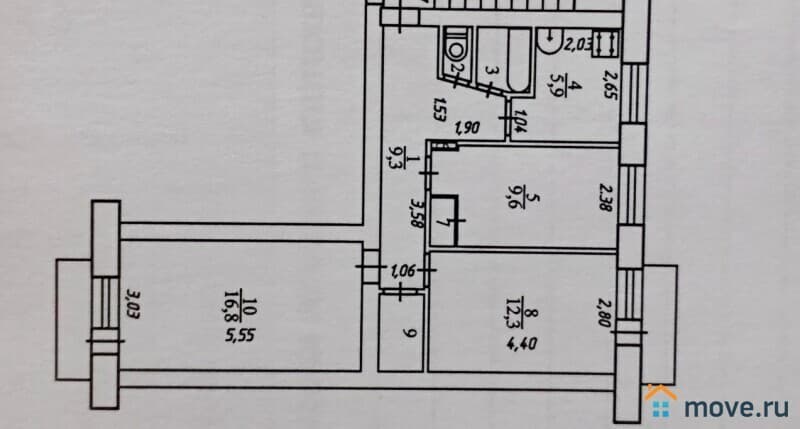 Общая площадь 59,2 кв.м., комнаты раздельные 16,8/12,3/9,6 кв.м., кухня 6 кв.м., с/у раздельный, два балкона (на разные стороны дома). Квартира требует ремонта.