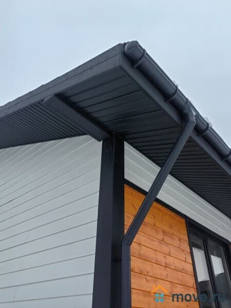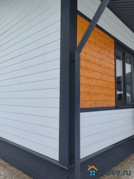 - Стены — газоблок D400, утеплитель, фасад: снаружи утеплён и отделан вибро цементными панелями.